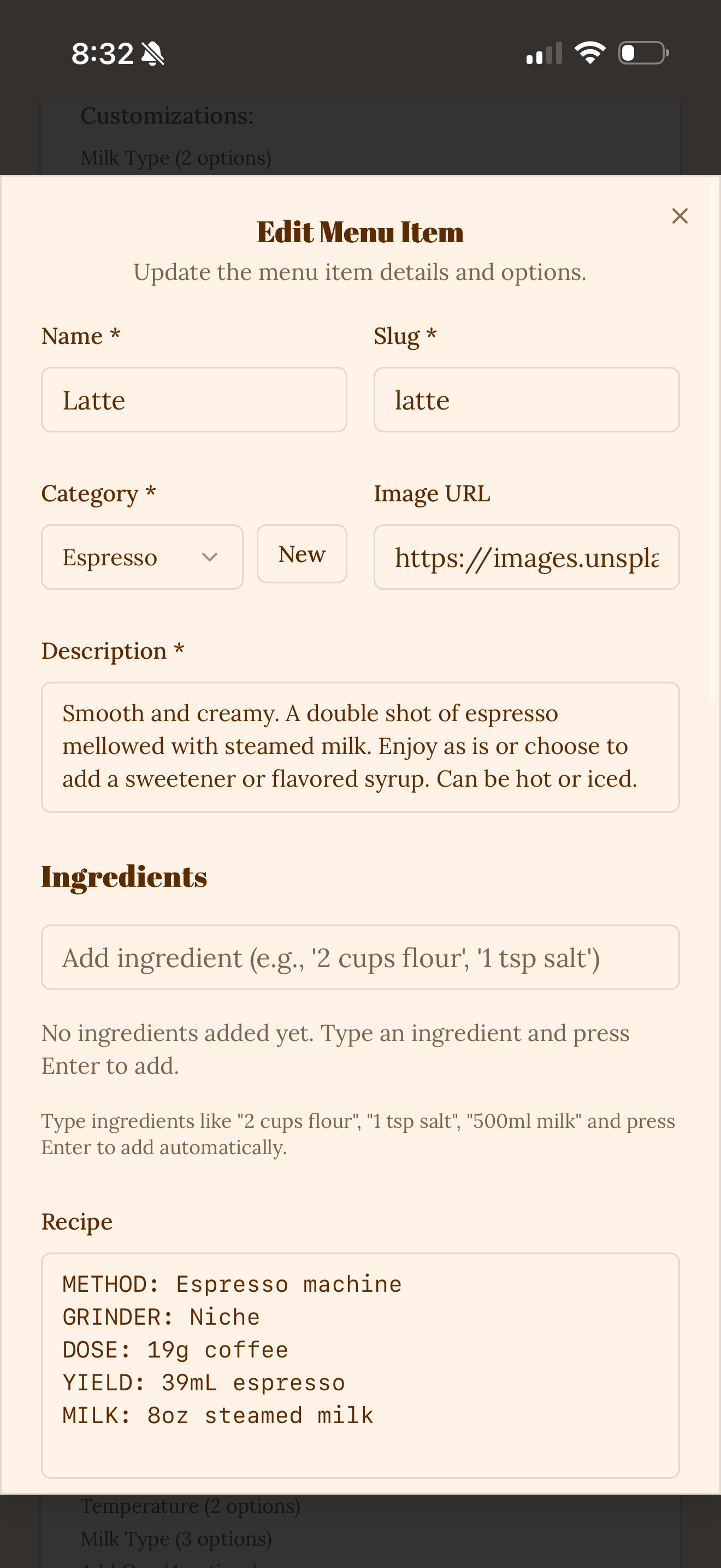 Adding a bar mode meant adding more drinks, as well as categorizing them as a cafe or a bar drink. Instead of hard coding - or asking Lovable - to do this each time, I wanted a way for us "baristas" to do it from the frontend.