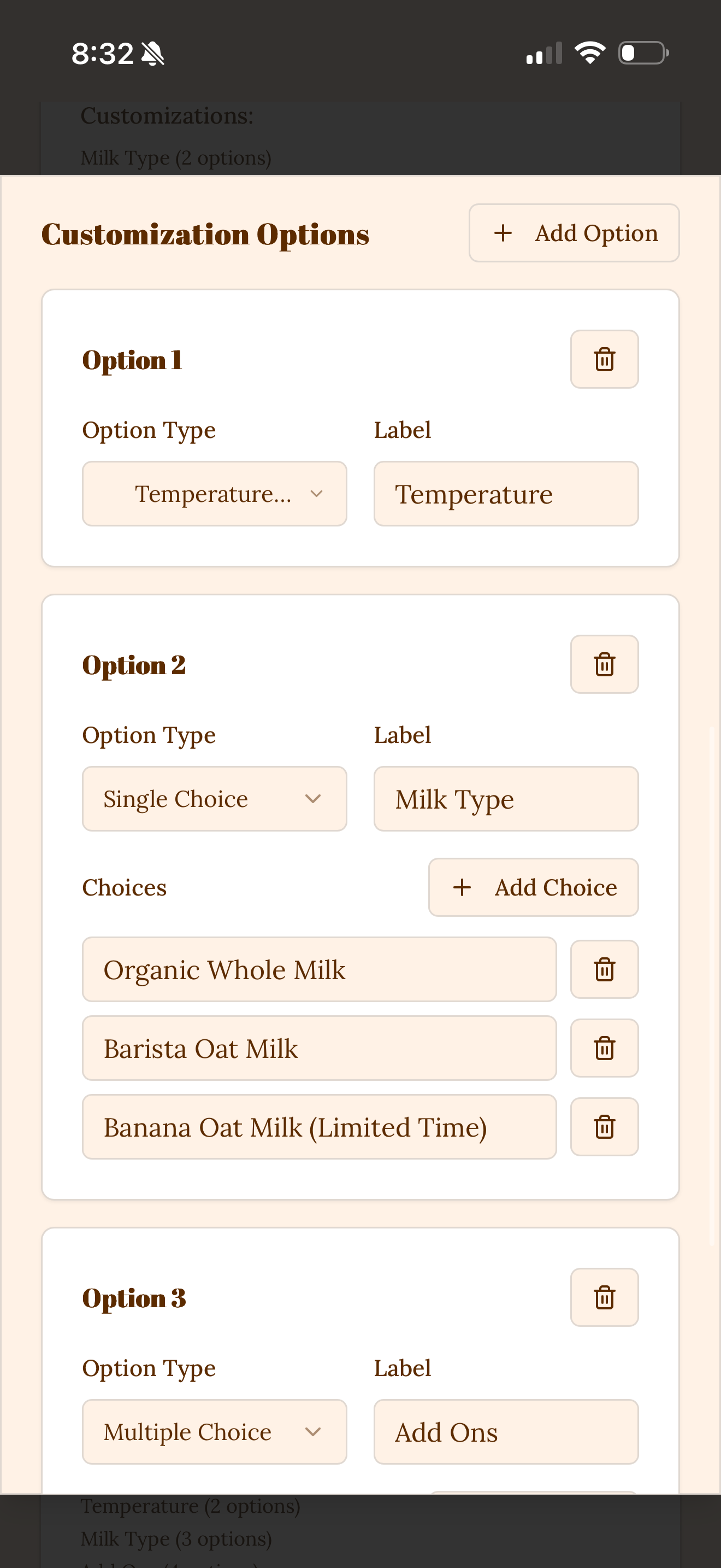 * Specify options for their drink