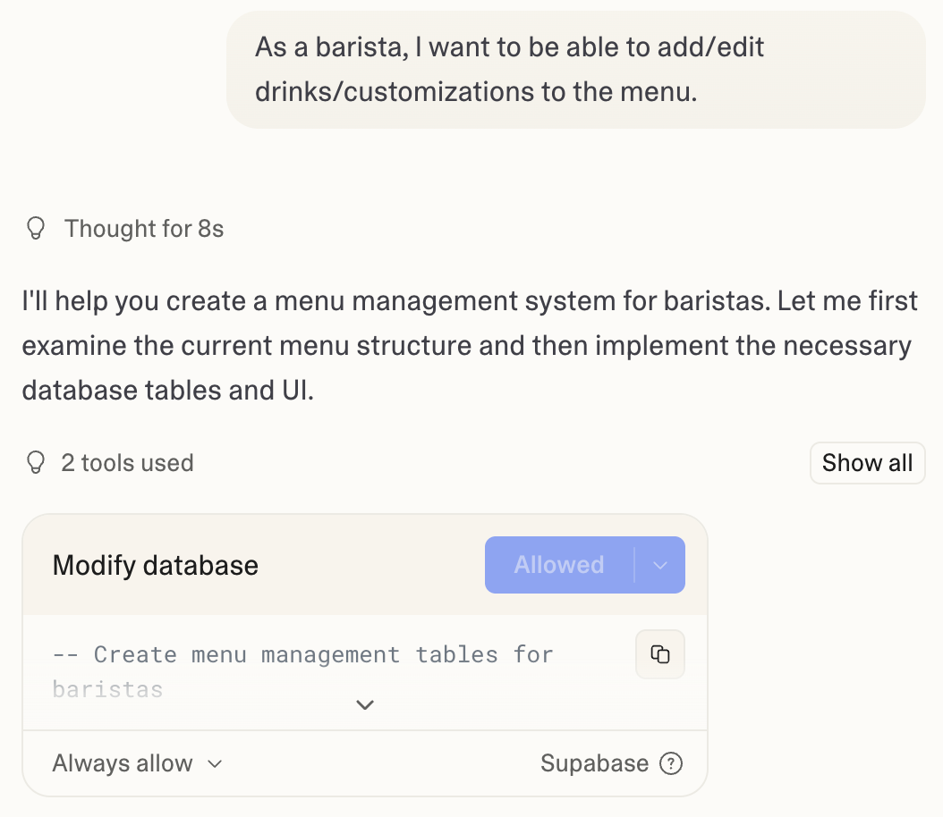 I was prompted to connect my project with Supabase that would then allow me to store and reference recipes, orders and order statuses, ordering modes, and barista login information.